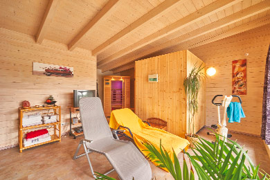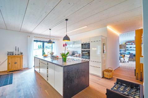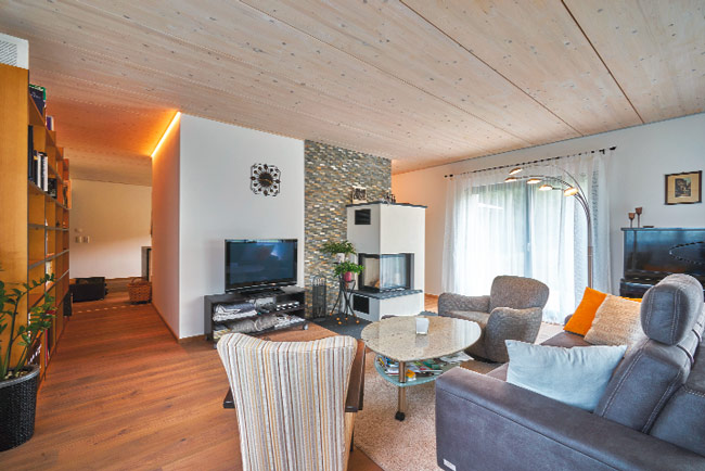Fügt man noch hinzu, dass es sich hierbei um eine Ökokonstruktion handelt, so kommt man dem „Geheimnis“ schnell näher. Dahinter verbirgt sich nämlich eine „Twinligna“-Bauweise der niederbayerischen Firma Sonnleitner Holzbauwerke. Die Firma hat sich auf Holzbau pur spezialisiert. Sie verwendet eine Tragkonstruktion aus Holz, ökologisch holzfasergedämmt, diffusionsoffen usw. Vorteil dieser ungewöhnlichen Bauweise: Innen und außen kann zweigleisig gefahren werden, also mit Holz und/oder Putz. Wie bei diesem Haus auch innen zu sehen ist. Beispielsweise ist das Erdgeschoss komplett verputzt, der Fitnessbereich unterm Schrägdach dagegen ist in Holz gehalten. Hier übrigens mit sichtbaren Deckenbalken, d. h. die Dachkonstruktion ist fester Bestandteil des Raumdesigns.