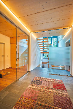 Eine Etage höher liegt der eigentliche Zugang zum Wohntrakt. Erstaunlich hell ist dieser Bereich: bedingt durch den hohen Fensteranteil im Treppenhaus und die beiden raumhohen Glaselementen im Flurbereich. Ungewöhnlich: Schiebelemente in Glas – ebenso praktisch wie schön!  Außerdem: Hier befindet sich ein zweiter Zugang, sodass das Haus auch von der mittleren Ebene aus zugänglich ist.