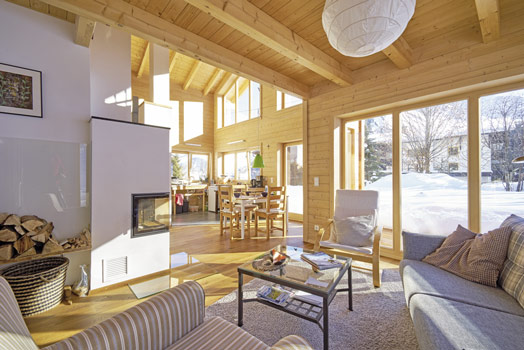 Hier stimmt einfach alles: Im Hintergrund das Gebirge, in Blickweite der Kirchturm eines idyllischen Bergdorfes, vor der Tür meterhoher Schnee und nur wenige Schritte bis zum Skilift. Die Lage: Wir befinden uns auf ca. 1350 m Höhe, in Hanglage, zu erreichen über eine steile Zufahrt (Gefälle ca. 10 Prozent!). Das Holzhaus, fast quadratisch (9,90 x 9 m), sieht aus wie ein normales Wohnhaus, passt sich der Umgebung an, nur die Raumaufteilung macht deutlich, dass es sich um ein hochwertiges und komfortables Ferienhaus handelt.