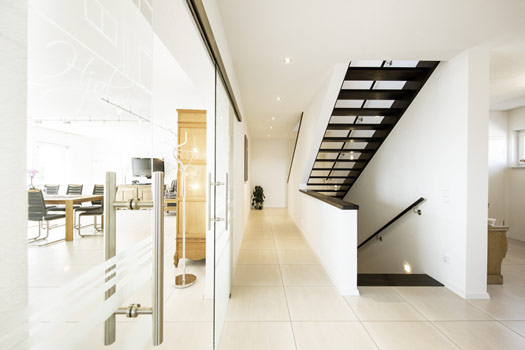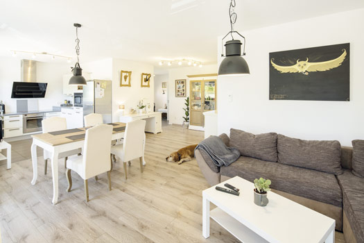 Das Erdgeschoss besteht aus zwei Wohnungen. Tochter Pia hat einen eigenen Eingang. Von ihrer Einliegerwohnung gelangt sie zudem über einen Durchgang in die Wohnung der Eltern. Diese erstreckt sich über zwei Etagen. Im Erdgeschoss befinden sich ein großer Wohnbereich mit offener Küche sowie ein Arbeitszimmer, ein Gästezimmer und ein Hauswirtschaftsraum. „Der Tisch im Wohnzimmer ist so groß, dass wir alle daran Platz finden“, erzählt Hjalmar Schmitt. „Das ist wichtig, weil wir oft und gern Besuch bekommen.“ Auch der Balkon – wegen der Hanglage im Erdgeschoss – ist mit fast 33 Quadratmetern großzügig bemessen.