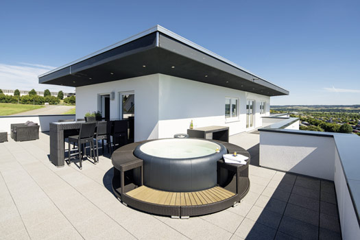Das Haus hat ein Flachdach, um die Dachterrasse darunter so groß wie möglich gestalten zu können. „Ich habe erst sehr gezögert“, gesteht Hjalmar Schmitt, „Flachdächer hatten früher immer mal Problemstellen und Lecks.“ Doch spätestens beim Bau lösten sich seine Befürchtungen auf. „Ich war dabei, wie das Dach verarbeitet wurde, das ist wirklich hervorragend gemacht“, kommentiert Schmitt, der mit seinem Vater am alten Haus selbst viel gebaut und mit angepackt hatte. Ohne das Flachdach wäre die Terrasse nur halb so schön geworden, ist er sich sicher.