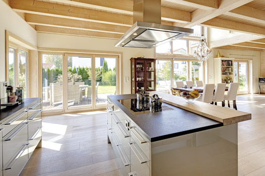Hier wird der Beweis angetreten, dass Regionalismus im Hausbau nach wie vor ein Thema ist und man auch heute noch oberbayerisch bauen kann. Unter Berücksichtigung einer behutsamen Anpassung an heutige Gegebenheiten. Exemplarisch wird dies sichtbar bei diesem Entwurf, der von Sonnleitner Holzbauwerke realisiert wurde und unter der Bezeichnung „Oberbayern“ gelistet wird. Der lang gestreckte Baukörper mit dem flachen Satteldach (18 Grad) und dem hohen Kniestock (255/284 Zentimeter) zeigt ein zweigeschossiges Haus mit Balkendecke und Dachstuhl, beide sichtbar, die das Innenleben optisch prägen. Spektakulär: Die Galerie mit Luftraum bzw. offener Decke über dem Wohn-Essbereich und eine weitere (Schlaf-)Galerie, die im Kindertrakt zu entdecken und als „Abenteuerspielplatz“ für den Nachwuchs zu verstehen ist.