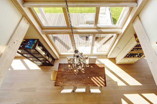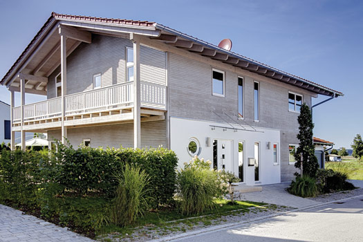 Gelungen außerdem das traufseitige Fensterband auf der Terrassenseite, das die Galerie, den Luftraum und den Wohnbereich großflächig mit Licht versorgt. Zeitgemäß ist die Konstruktion: Effizienzstandard 70 wird ausgewiesen! An der Eingangsseite zeigt sich eine Kombination aus Holz- und Putzfassade, wiederum ein sehr oberbayerisches Stilmerkmal. Zum Einsatz kommen hier Sonnleitners ökologische Wandsysteme „Twinligna“ und „Monoligna“
