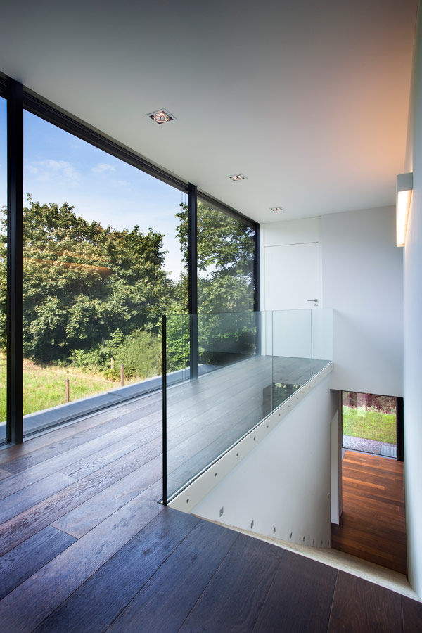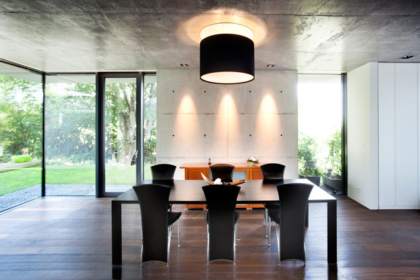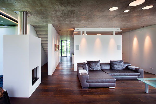 Ebenerdig erstreckt sich auf fast 120 m² ein großzügiger Raum mit Wohnbereich, Kochinsel und Essbereich, die riesigen Fensterflächen holen die Natur ins Haus. Blickachsen waren ein zentraler Wunsch der Bauherren: Aus jeder Perspektive bietet sich ein neuer, faszinierender Ausblick ins Freie. Sichtbetonwände und Decken, weiße Wände und Möbel sowie ein dunkler Holzboden harmonieren miteinander. Eine in Sichtbeton gegossene und trotzdem filigrane Treppe führt ins Obergeschoss: Sie wurde im Betonwerk individuell eingearbeitet und später mit einem Kran millimetergenau in den Rohbau eingepasst.