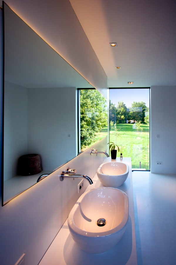 Auf Tastsensoren (ebenfalls von Gira) in den Räumen lassen sich ganze Szenen abrufen, beispielsweise eine reduzierte Lichtszene mit heruntergefahrenen Jalousien zum Kinoabend oder eine gezielte Beleuchtung am Esstisch mit dezenter Hintergrundmusik. „Vor Verlassen des Hauses können mit einem Tastendruck alle Energiequellen im Haus deaktiviert werden“, erklärt Klaus Geyer einen cleveren Weg, Energie zu sparen. Leuchten und Lautsprecher sind zum Teil dezent als Decken- oder Wandeinbauvarianten in die Architektur integriert. Ein Multiroom System versorgt unabhängig voneinander vier Zonen mit Musik von zentralen Audioquellen aus. Die Gira Schalterprogramme Esprit Glas Weiß und E2 Reinweiß passen bestens zur puristischen Architektur.