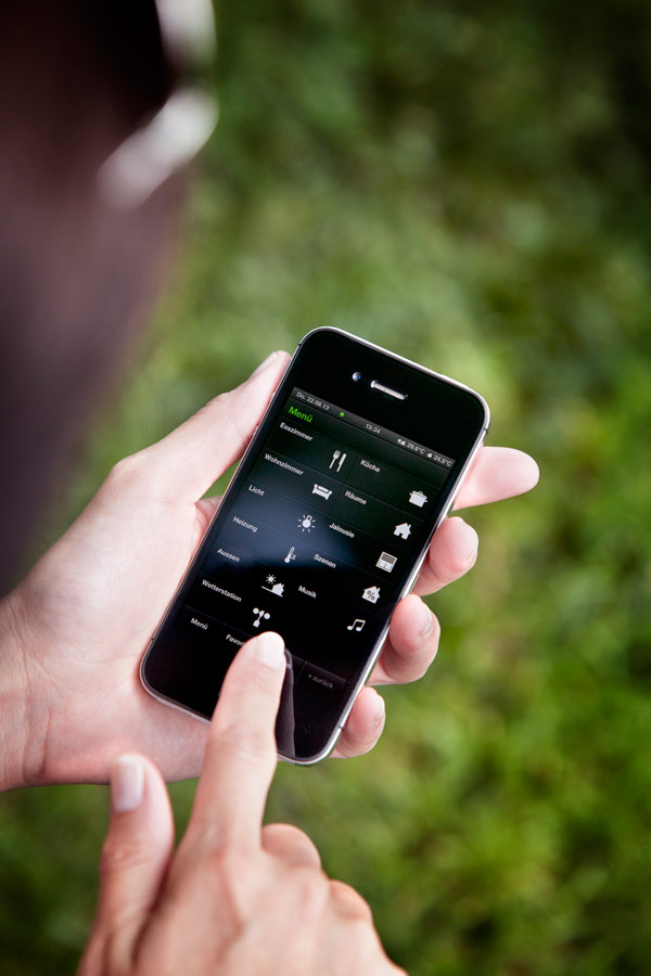 Die technikaffinen Bauherren wollten mit ihrem Traumhaus auch ein zukunftsfähiges, intelligentes Haus bauen. Daher entschieden sie sich für ein System, das alle Komponenten der Haustechnik miteinander vernetzt. Das „Gehirn“ hinter dem Bussystem ist ein leistungsstarker „HomeServer“ vom Hersteller Gira, in dem sämtliche Informationen zusammenlaufen, ausgewertet und entsprechende Befehle an sogenannte Aktoren gesendet werden. Gesteuert wird daheim oder von unterwegs aus übers iPad oder iPhone: Die Visualisierung ist selbsterklärend. Alle Leuchten im Haus lassen sich von hier aus aktivieren, Jalousien hoch- und runterfahren, die Heizung regulieren und vieles mehr. Einige Funktionen laufen auch automatisch im Hintergrund ab: Meldet die Wetterstation starken Wind, fahren die Jalousien hoch. Geplant, installiert und programmiert wurde die Gebäudetechnik vom System-Integrator Klaus Geyer: „Praktisch ist, dass sich das System jederzeit umprogrammieren, den Bedürfnissen anpassen und aufrüsten lässt – ohne die Wände aufreißen zu müssen, denn die Infrastruktur, die Kabel, liegt ja bereits.“