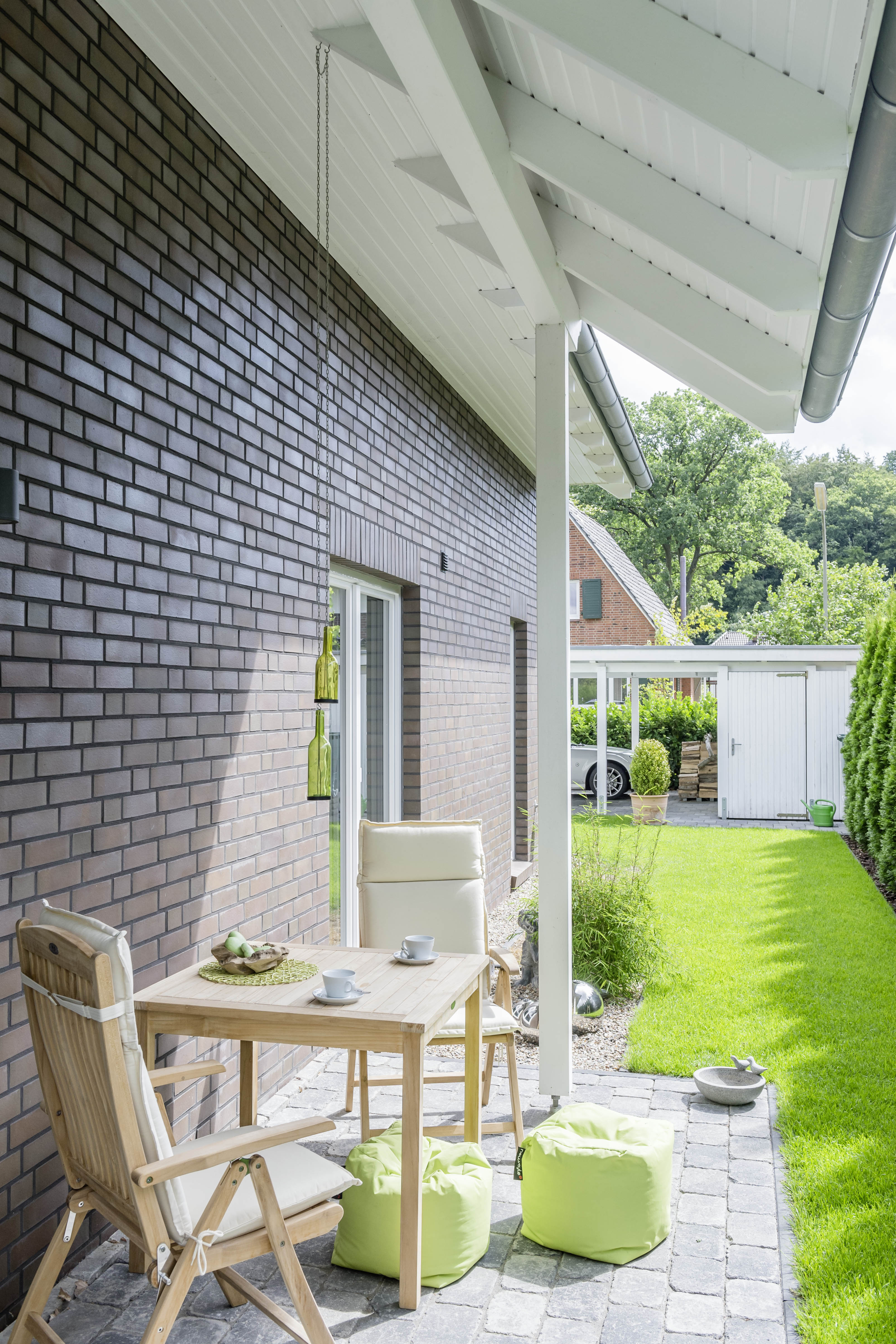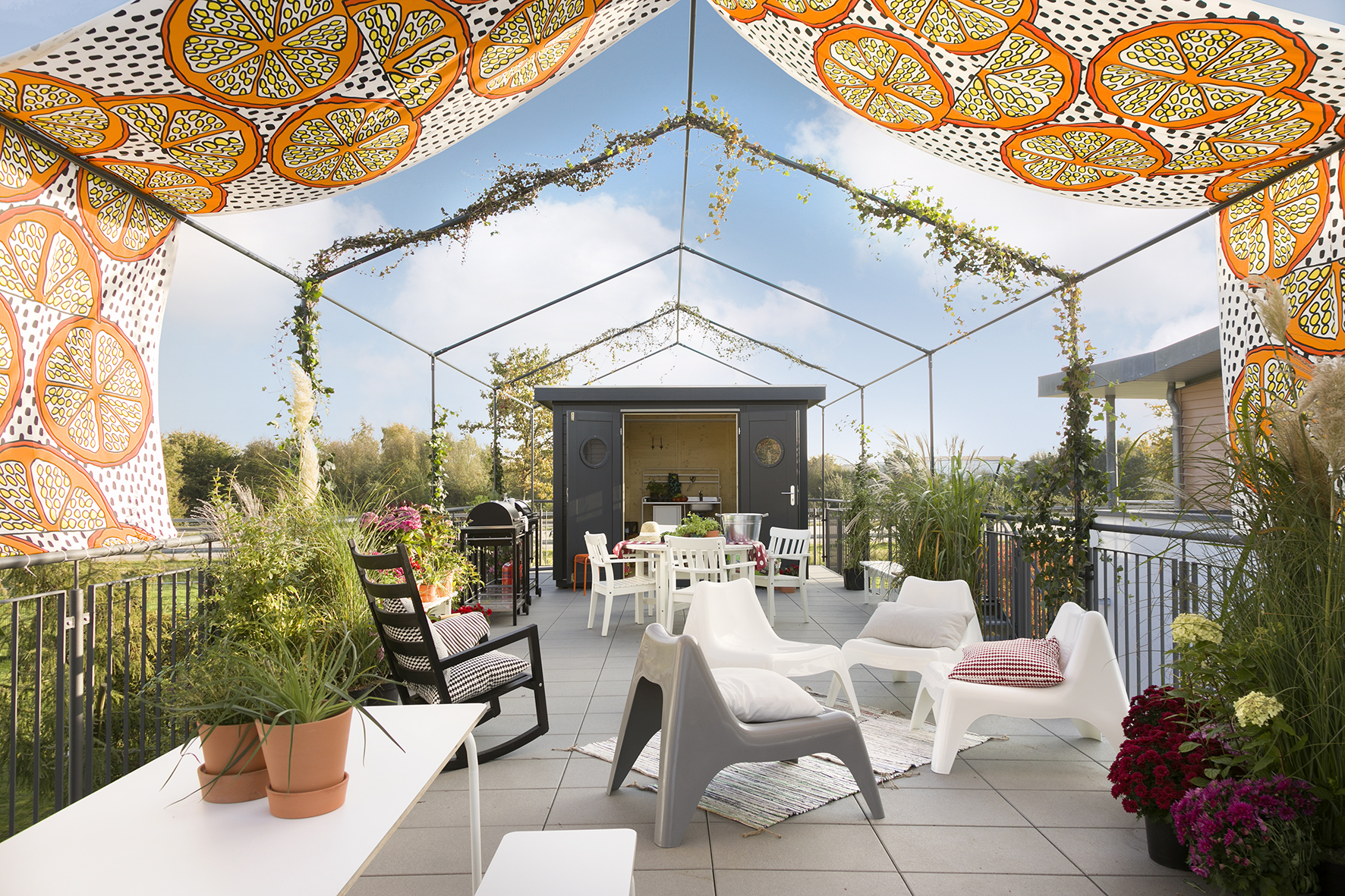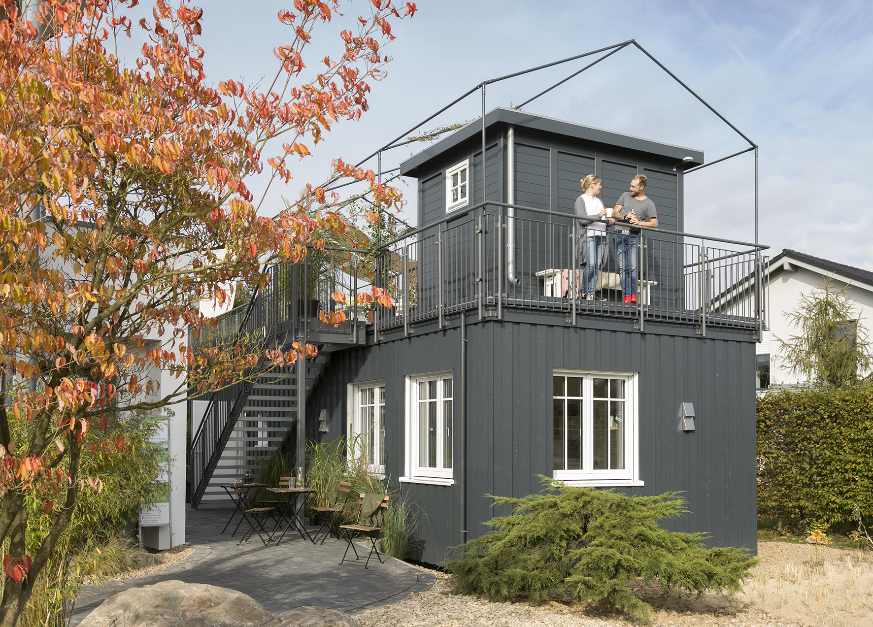 Dass auf dem kleinsten Grundstück Platz für einen Garten mit Gemüsebeet, Grillstation und Loungebereich ist, zeigt das Green Living Space in Langenhagen mit seiner cleveren „Urban Gardening“-Lösung auf dem Dach. Hier veranstalten Maria und Sören stimmungsvolle Kochevents im Freien. Einige Zutaten für ihre Bio-Menüs produzieren sie selbst. Salat und Kräuter ziehen sie in Pflanzgefäßen, Bohnen und Kletterpflanzen ranken sich an dem Gestänge für den Sonnenschutz. Dazwischen sind unterschiedlichste Sitzmöbel verteilt. Im schicken Design-Gartenhaus aus heimischen Hölzern lassen sich Vorräte lagern und Gartengerät unterstellen. Auch hier ist nichts statisch, die Verschattungsplanen lassen sich mal zum Partyzelt aufspannen, mal bleiben sie auf dem Sonnendeck zusammengerollt. Selbst das Gestänge ist nachträglich montierbar, sodass das Zuhause mit den finanziellen Mitteln wachsen kann: zuerst das Wohnmodul, dann die Außentreppe, es folgt das Gartenhaus als hochwertiger Bausatz zum Selbstaufbau, schließlich das Gestänge – ein tolles Konzept für einen nachhaltigen Lebensstil.