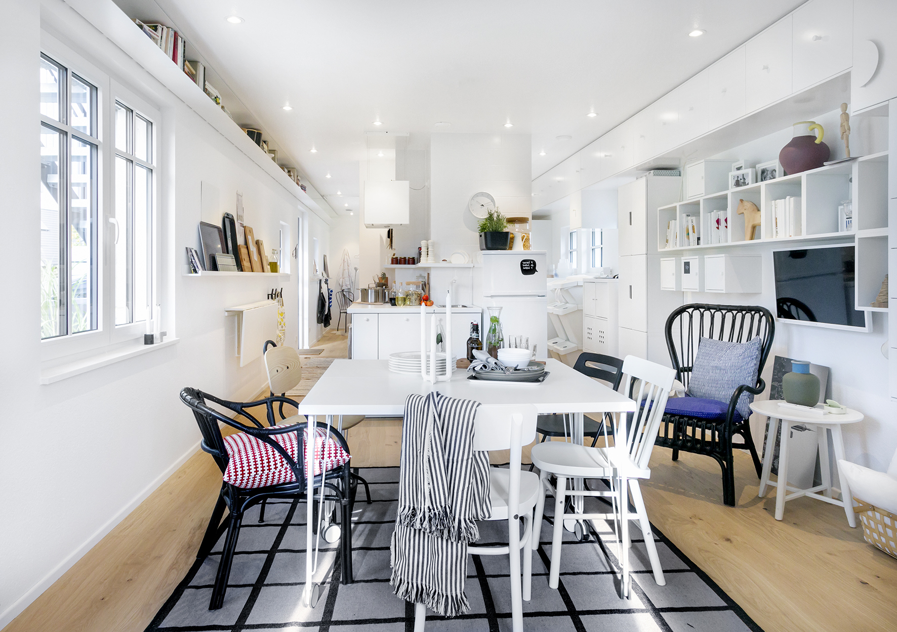 In dem Musterhaus auf unseren Bildern (in Langenhagen) umfließt ein einziger großer Raum eine „Box“ in der Mitte mit Versorgungstechnik für Küche, Waschmaschine, Bad und separates WC. Es entsteht ein spannender „Open Space“ mit ganz unterschiedlich definierten Zonen: großzügiger Ein-gangsbereich mit Garderobe und separatem WC, praktisch ausgestattetes Kochzentrum, komfortabel und flexibel gestaltbares Wohnen, schmaler Funktionsgang mit Wasch-maschine, Ankleide und viel Stauraum, über Vorhänge abgrenzbarer Schlafbereich mit viel Privatsphäre. Ein anregendes Ambiente, das – physisch wie mental – Spielraum lässt und kreative Ideen fördert.