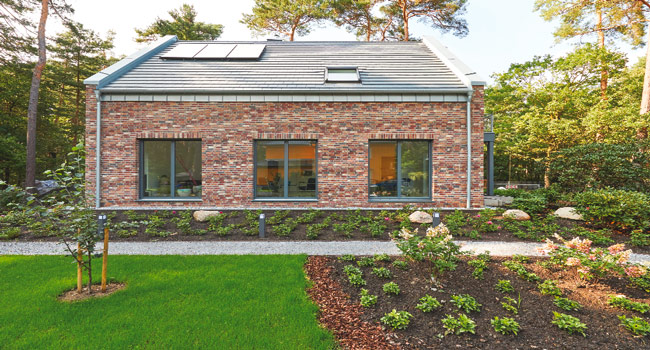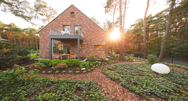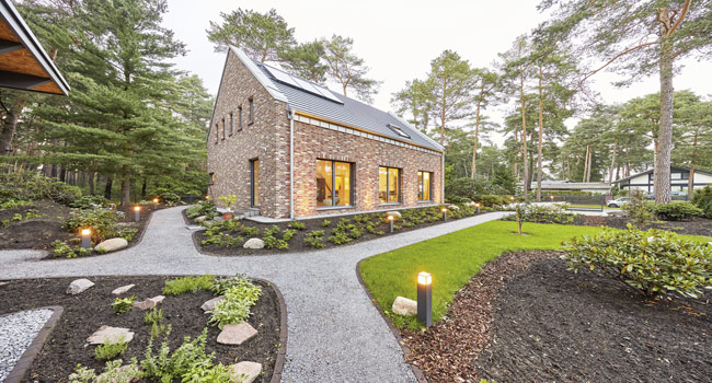 Der rotbraune Verblendstein des Wohnhauses und des angrenzenden Gartenhauses fügt sich perfekt in die naturbelassene Umgebung ein. Das Farbspiel der aus verschiedenen Erdtönen gemischten Verblendfassade erinnert an die Rinde eines Baumes. Mit Bedacht verteilte Bodenleuchten setzen das Haus in der Dämmerung gekonnt in Szene und inszenieren auf dem vom Wald umzäunten Grundstück märchenhafte Blickfänge. Ein schmaler Kiesweg verbindet das Wohnhaus mit dem ebenfalls verklinkerten Gartenhaus und unterstützt das traumhafte Idyll.