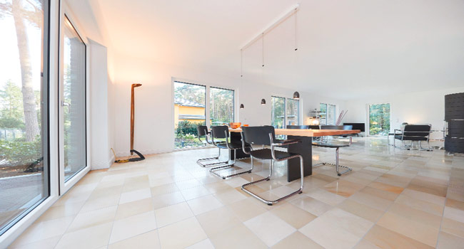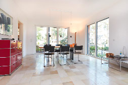Vom überdachten Hauseingang des 1,5-geschossigen Einfamilienhauses betritt man die einladende Diele und muss sich zwischen zwei Eyecatchern entscheiden: Zum einen fällt der Blick auf die in Einfamilienhäusern eher untypische Aufzugtür, zum andern fesselt der Blick durch die große verglaste Doppeltür in das elegante Wohn-Esszimmer. Helle Naturstein-Bodenfliesen, Designermöbel und ein moderner Schwedenofen laden zum gemütlichen Verweilen ein. Bodentiefe Doppelfenster gewähren einen uneingeschränkten Rundumblick in den park-ähnlichen Garten. Das offen integrierte Esszimmer und die sich anschließende Küche mit praktischer Speisekammer wurden bewusst durch eine Tür getrennt. Die schwarze Arbeitsfläche der modernen Einbauküche bildet einen idealen Kontrast zu den sonst weißen Oberflächen.