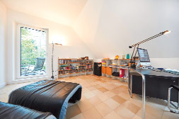 Zurück auf der Diele muss man sich entscheiden: hinauf ins Obergeschoss über die maßgefertigte Treppe oder mit dem luxuriösen Aufzug. Dieser bietet Platz, um auch mit einem Rollstuhl die erste Etage und somit das Arbeitszimmer sowie beide Schlafzimmer, das Ankleidezimmer oder die zwei getrennten Bäder zu erreichen. Über beide Schlafzimmer ist der kleine gemütliche Balkon erreichbar, der einen traumhaften Blick auf den Scharmützelsee bietet. Nicht alltäglich ist die Badlösung, bei der sich die Bauherren für zwei getrennte Bäder (eines mit Wanne, eines mit Dusche) entschieden.