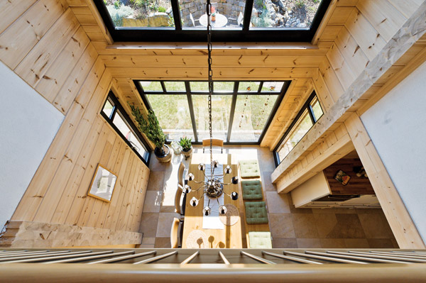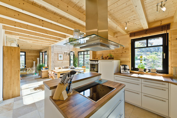 Ausschließlich natürliche Materialien nutzten die Eigentümer auch für den Ausbau und die Einrichtung. Geheizt wird mit Holzscheiten, mit denen zum einen der Kessel mit Warmwasserregister im Keller befeuert wird und zum anderen der Kaminofen im Wohnbereich gefüttert wird. Die Wassererwärmung, auch für die Fußbodenheizung, wird von einer solaren Anlage unterstützt. „Ein mit den eigenen Händen gebautes Haus schafft eine besondere Bindung daran“, wissen die Eigentümer. Zusammen mit dem Richtmeister des Hersteller und Freunden bauten sie Haus „am Bächle“ in nur fünf Tagen auf, inklusive Dachstuhl und Fenstern. Den Innenausbau machten sie komplett in Eigenregie, teils mit Hilfe von Fachbetrieben vor Ort. Offenes Wohnen mit fließendem Übergang von der Küche zum Esstisch bis in die Sofaecke bestimmt das Haus, wobei ein L-förmiger Grundriss im Wohnbereich ermöglicht, dass man von dem Sofa nicht gleich in die Küche sieht. Bodentiefe Fenster und ein komplett verglastes Quergiebelhaus bringen viel Tageslicht ins Haus. Ein hoher Luftraum verbreitet noch mehr Offenheit bis zum sichtbaren Firstbalken.