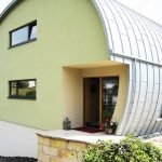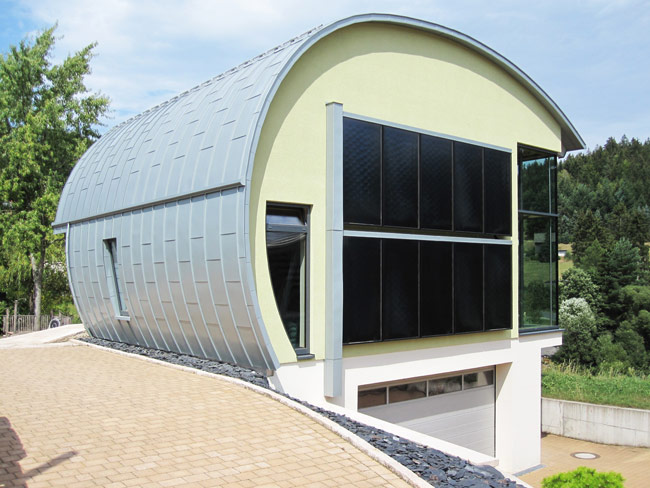 Das Haus erinnert an einen auf der Seite liegenden großen runden Behälter. Das runde Zinkdach umschließt das Gebäude zu drei Vierteln und lässt an der nichtbedeckten Seite eine große Fensterfront mit Dreifachverglasung frei. An den Stirnseiten befinden sich der Eingang und zwei Fenster, an der gegenüberliegenden Wand sind an der Fassade großflächige Solarpanelen angebracht, in der Rundung des Daches befindet sich ein schmales Fenster.