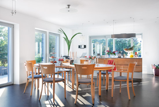 Geschickt setzte der Architekt die Wohnbedürfnisse der Baufamilie im Grundriss um: So kann man von der mittig gelegenen Kochinsel aus zugleich mit Gästen am runden Esstisch drinnen kommunizieren wie mit jenen am großen Tisch draußen auf der Terrasse. „Wir haben gerne Besuch und regelmäßig einen ganzen Haufen hungriger Mäuler zu stopfen, weil die Nachbarschaft reihum an je einem Tag für die Kinder kocht“, führt Erich Ritzmann aus. Die Hauswirtschaftsküche ist dagegen separat mit viel Stauraum angelegt. Damit wurde im Küchenbereich mehr Platz für Terrassentüren anstelle der Stellflächen für Küchenschränke frei. So kann noch mehr Tageslicht die Räume durchfluten. Ein kombiniertes Gäste- und Arbeitszimmer sowie ein Duschbad komplettieren das Erdgeschoss, das damit im Alter als eigenständige Wohneinheit nutzbar ist. Auch den Grundriss im Obergeschoss kennzeichnen praktische Überlegungen. Warum sollte man zum Beispiel die Schmutzwäsche zum Rei-nigen erst aufwändig ins Erd- oder gar Kellergeschoss tragen, wo sie doch zumeist im Obergeschoss anfällt? Anstatt nun einen teuren Wäscheabwurf einzuplanen, wurde das Kinderbad größer angelegt und mit Schränken, Waschmaschine und Trockner ausgestattet. Den Kindern kommt das Mehr an Spielfläche durch den Wegfall der Kleiderschränke in ihren Zimmern zugute.
