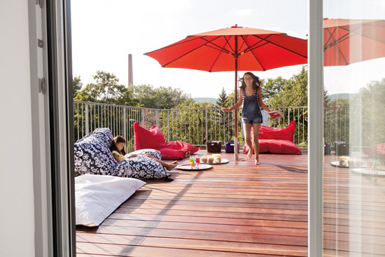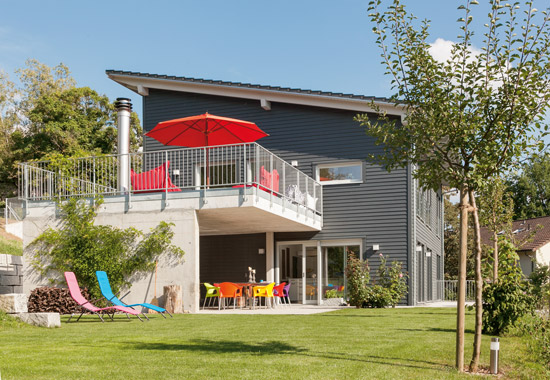 Gemäß dem Minergie-P-Konzept, wonach eine größere Fassadenfläche auch mehr Wärme entweichen lässt, ist der Baukörper schlicht gehalten und mit einem architek-tonisch gut dazu passenden Pultdach versehen. Dezente Französische Balkongeländer aus Glas, von der Baufamilie in Eigenleistung beige- bracht, verleihen dem Haus seine besondere Note. „Eigentlich hatten wir uns ja eine Eternitfassade vorges-tellt“, sagt Erich Ritzmann. „Man riet uns im Ausstattungszentrum aber davon ab – eine Holzfassade sei viel kostengünstiger und ökologischer. Eine gute Idee.“ Auch die Entscheidung für Holz-Alu-Fensterrahmen fiel aufgrund nachhaltiger Überle- gungen, denn sie sind langlebig und dabei wartungsarm. „Die zwei Tage Bemusterung bei SchwörerHaus waren hart, aber danach war unser Haus definiert und wir mussten nicht mehr ständig neue Entscheidungen treffen“, erzählt der Bauherr. „Nach der Kellermontage dauerte der Hausaufbau selbst dann nur drei Tage. Im Vergleich zu Freunden, die zur gleichen Zeit Häuser gebaut haben, war unsere Bauzeit regelrecht entspannend.“