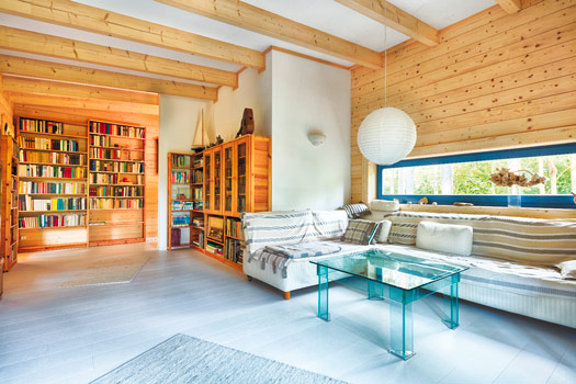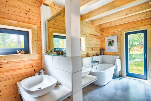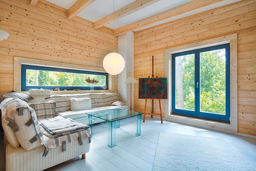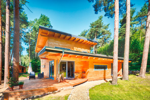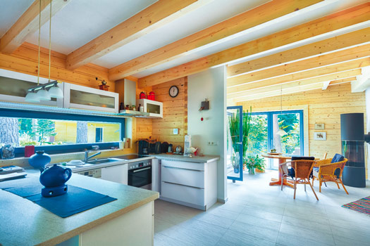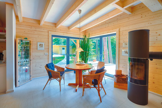 Das LéonWood®-Blockhaus „Kalevala“ ist die perfekte Symbiose aus Innovation und Ursprünglichkeit: alles fließt – der Blick wird von innen nach außen und umgekehrt geleitet. Die nachhaltigen Baustoffe Holz und Kork, die LéonWood® in der Bio-Doppelwand® verbaut hat, machen das Blockbohlenhaus außerdem zu einer Ökobombe – wohngesundes Raumklima inklusive.